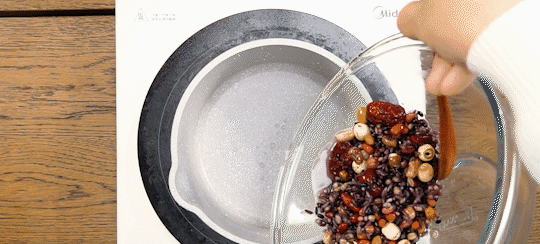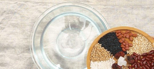 2. Pour all the soaked ingredients into the pot and add 750 ml of drinking water. Turn on high heat, bring to a boil, then turn to medium and medium heat, and cook for half an hour.