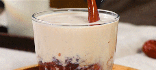4. Then fill half a cup of Laba porridge, and pour 20 g of creamy ricoe and 40 g of milk in turn.