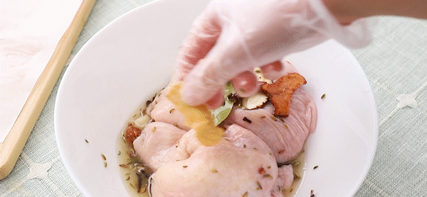 3. Put the cleaned boneless duck leg meat into a bowl filled with flavoring, mix well with your hands, and marinate for 2 hours to make the duck leg meat fully flavored