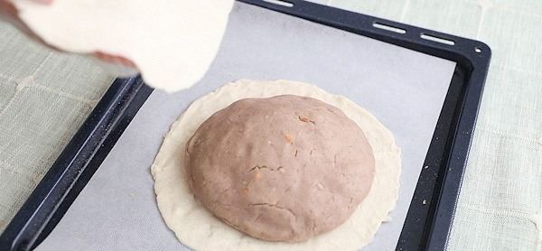 9. Sprinkle bread crumbs on the baking tray, put a scallion cake, then fold a piece of taro paste wrapped in duck meat, then cover a scallion cake, and pinch the edges tightly.