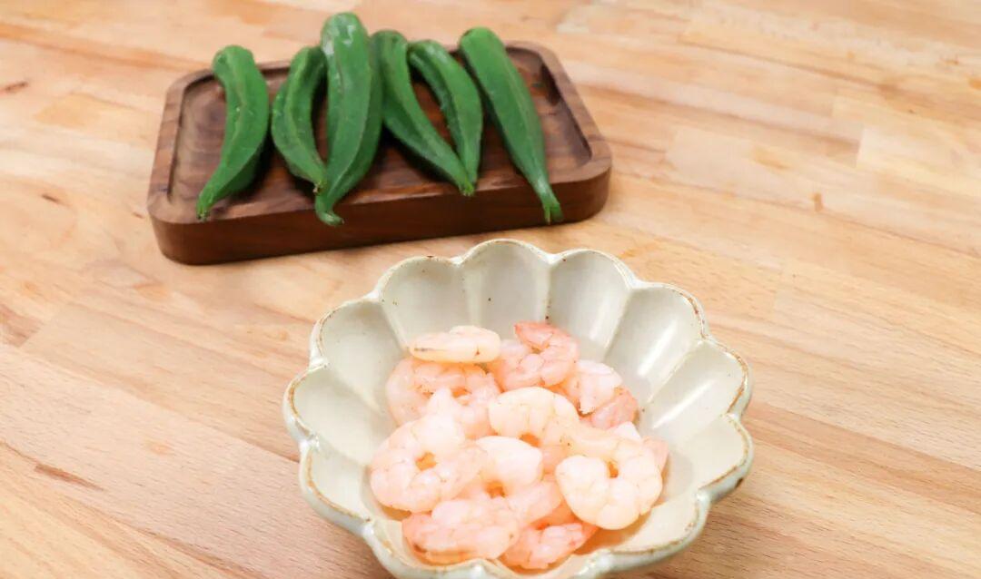 2. Blanch the washed okra and the shrimp with removed shrimp threads in a boiling water pot respectively, and put them in ice water for later use.
