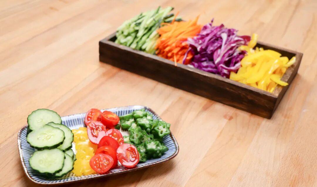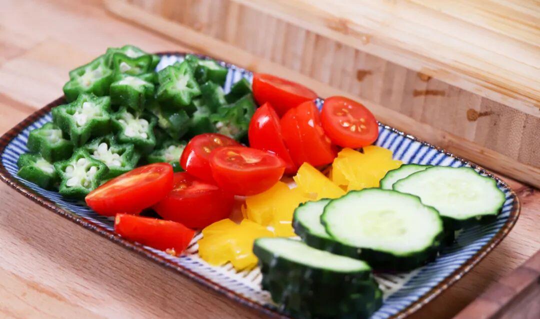 3. Remove okra from ice water, wash tomatoes and cucumbers, slice them separately, and set aside.