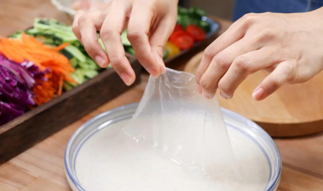 4. Take a disc with a larger diameter than Vietnamese spring roll skin, pour warm water at about 60 degrees, put it in Vietnamese spring roll skin, and soak it for about 5 seconds.