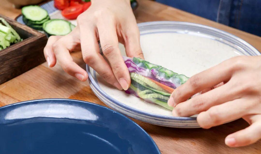 6. Fold the Vietnamese spring roll skin on the left and right sides to the middle, wrap the two sides of the ingredients, then wrap the lower spring roll skin upward around the bottom ingredients, then pick up the upper spring roll skin, stack the top ingredients on the bottom ingredients, and finally the edge of the spring roll skin is cushioned on the bottom.