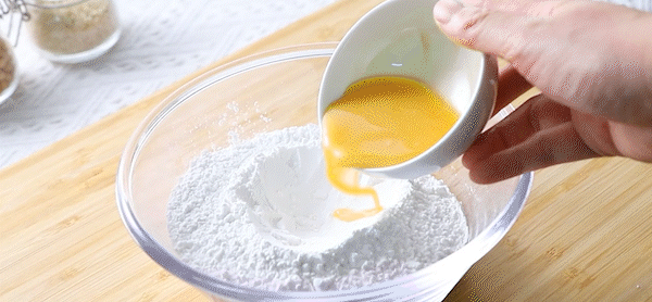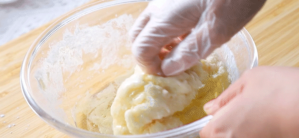 1. Add 250 g mochi ready-mixed powder, 30 g egg liquid, and 150 g water to the bowl and stir until there is no dry powder