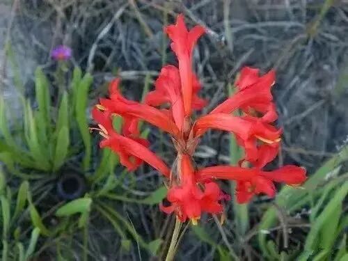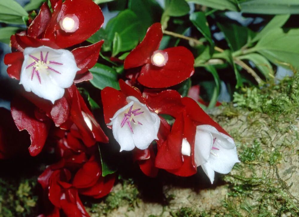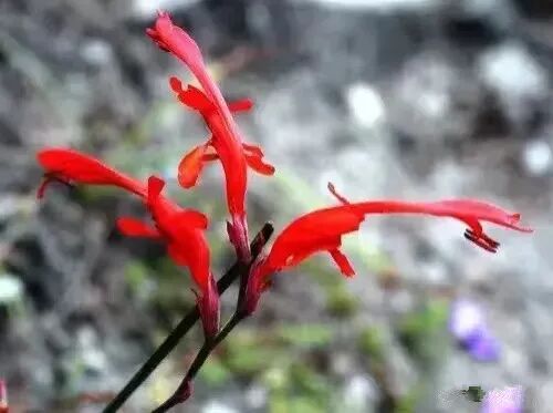 Brilliant red hanging nails are distributed in the Andes Mountains, and the flowers are slender anchor-shaped (the flowers droop, the flower tubes are slender, the crown edge is six lobes, and the lobes are thin and reflexed upward). The flowers are bright red and the stamens are yellow.