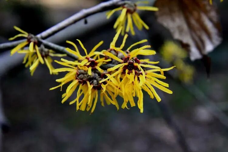 Japanese witch hazel comes from Japan. Its petals are slender (like the effect of wintersweet blossoms entering a paper shredder), and it also has purple sepals and charming fragrance.