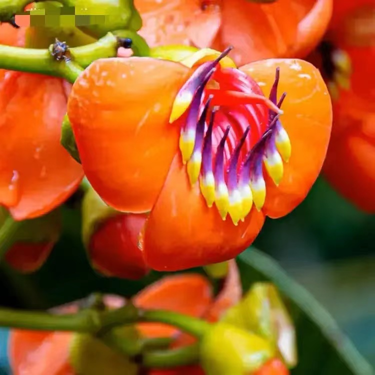 Wameding flower comes from Fiji, and its ornamental value is very high. When it is in full bloom, its flowers will hang down, and its colors are contrasted sharply: The filaments are white, the anthers are purple, the base lobes are yellow, and the inflorescence branches and bracts are scarlet or crimson, which is beautiful.