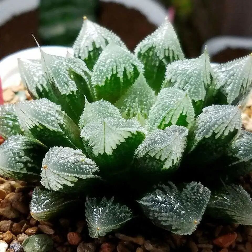 The leaves of Snowflake Jade Dew are short and triangular, transparent and light green. With white speckled snowflakes , with only tiny hairs on the top, Hardly growing lateral buds 。