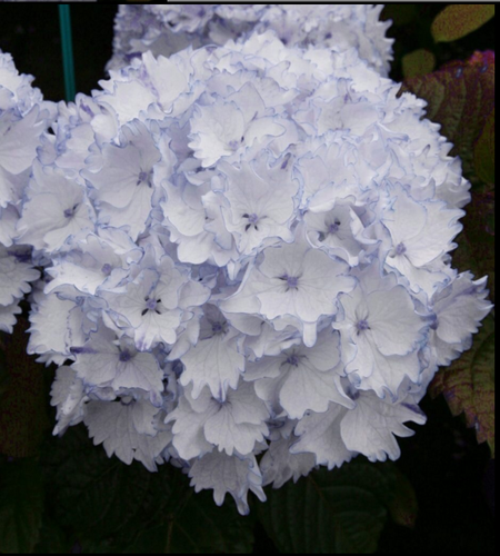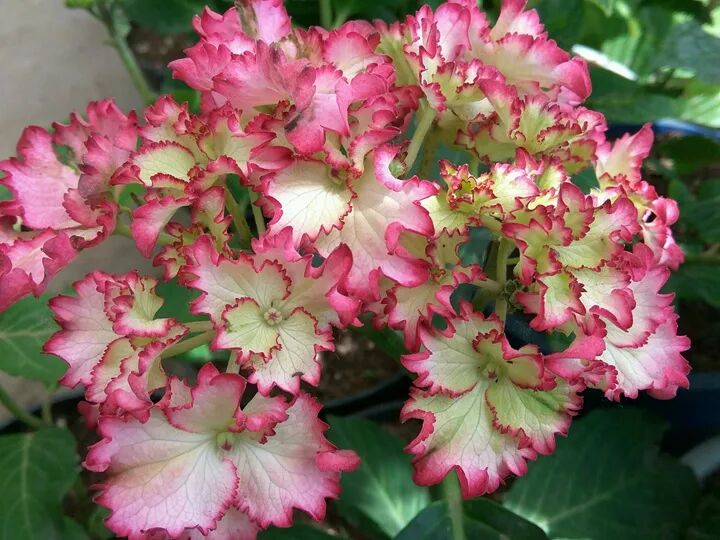 Single polychromatic hydrangea variety with creamy white (with light green) petals with purple-red margins, The petals are not only ruffled, but also jagged, blooming like leaping flames , very beautiful, flowering from May to September.