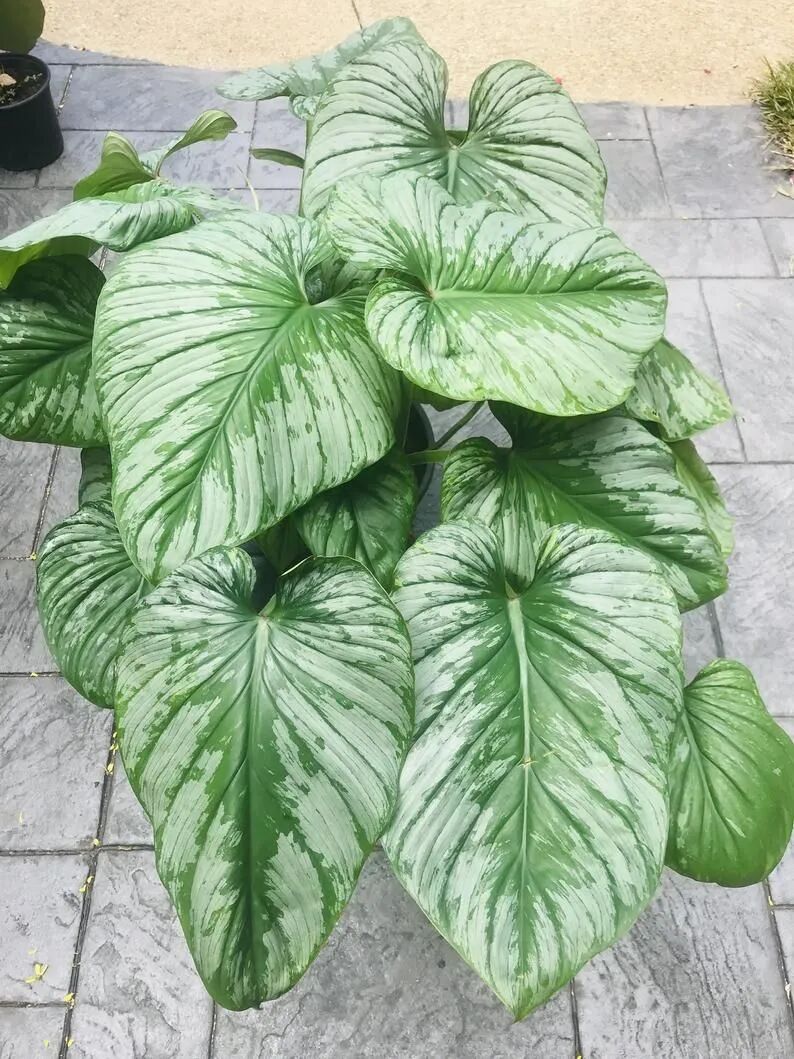 The leaves of brandy green velvet are heart-shaped, with olive green base and large areas of silver-gray markings.