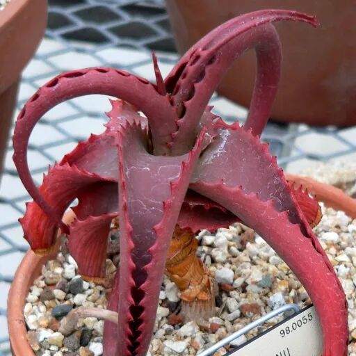 Aloe van Baren, also known as Aloe Red, has curly and twisted leaves, usually green, and turns reddish brown when out of state. Looks like some kind of sea creature.