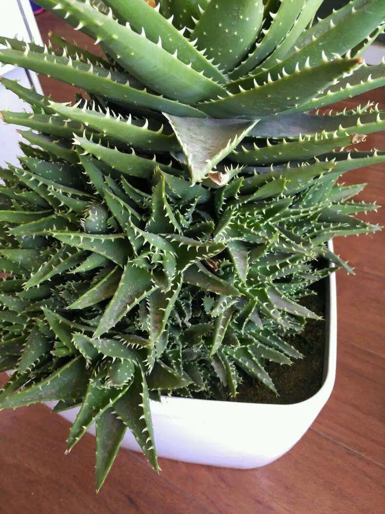 The leaves of aloe vera are lanceolate, gray-green covered with thin powder, and there are white thorns on the margin and back of the leaves (which will slowly turn reddish brown in the later stage). The blades are arranged in a rosette, curved inward and wrapped together, so When the plant is young, it resembles a round ball of thorns.