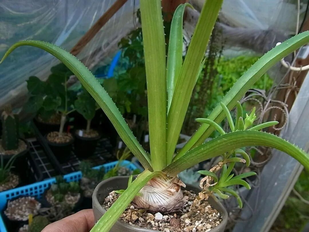 The leaves of aloe vera are slender, green, rolled inward, with round bulbs, Looks like an onion