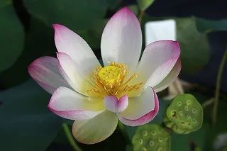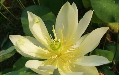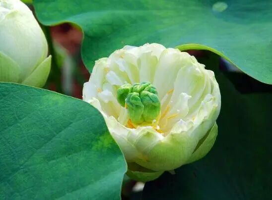 Double-petal type, the flowers are all in full bloom, like a bowl shape, the petals feel slightly rough, and the flower color is white with some yellow and green. The receptacle is cup-shaped, the lotus plump is oblate,
