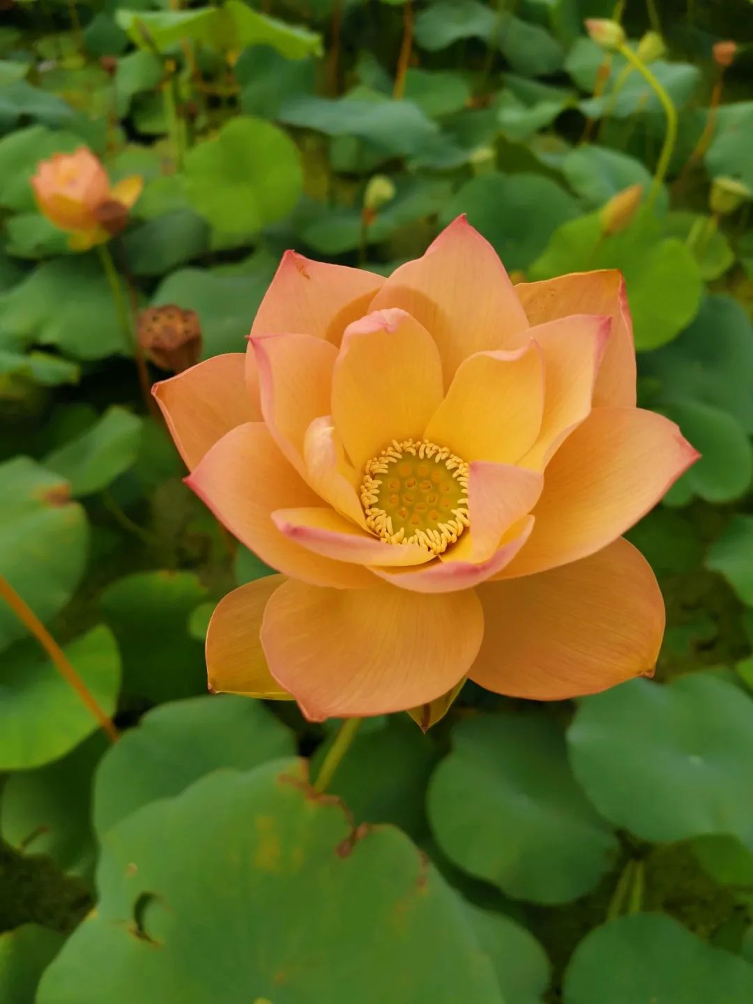 Large lotus, double-petaled, with changeable colors (orange-pink at first, then pink, and finally yellow). Overall graceful and luxurious.