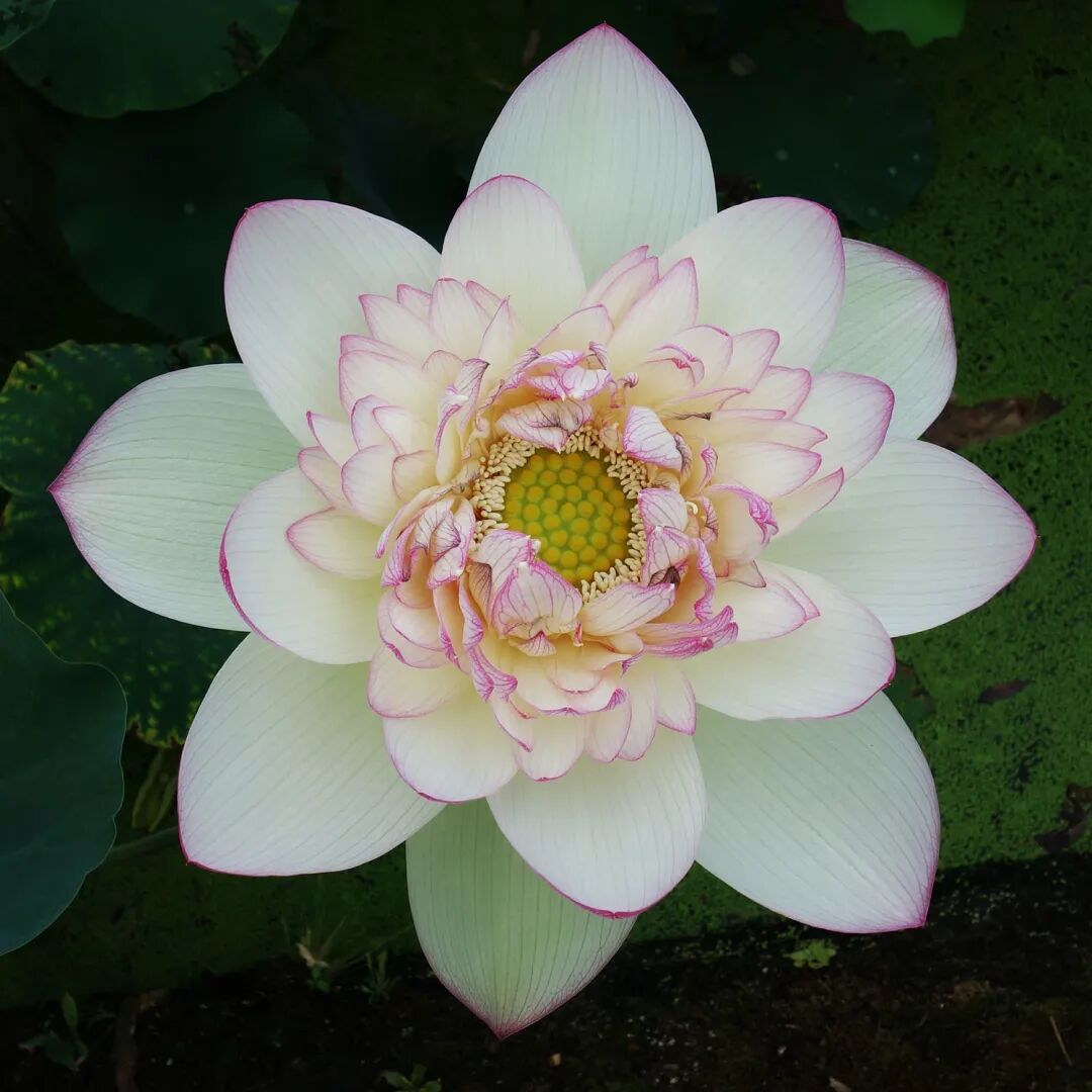 Double petal type, unique yellow-green flower color (the outer petals are greenish), and the lotus platform is cyan. Slow growth with fewer lateral buds.