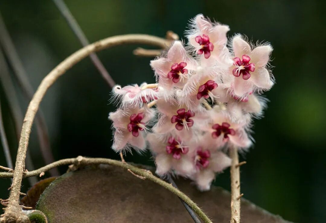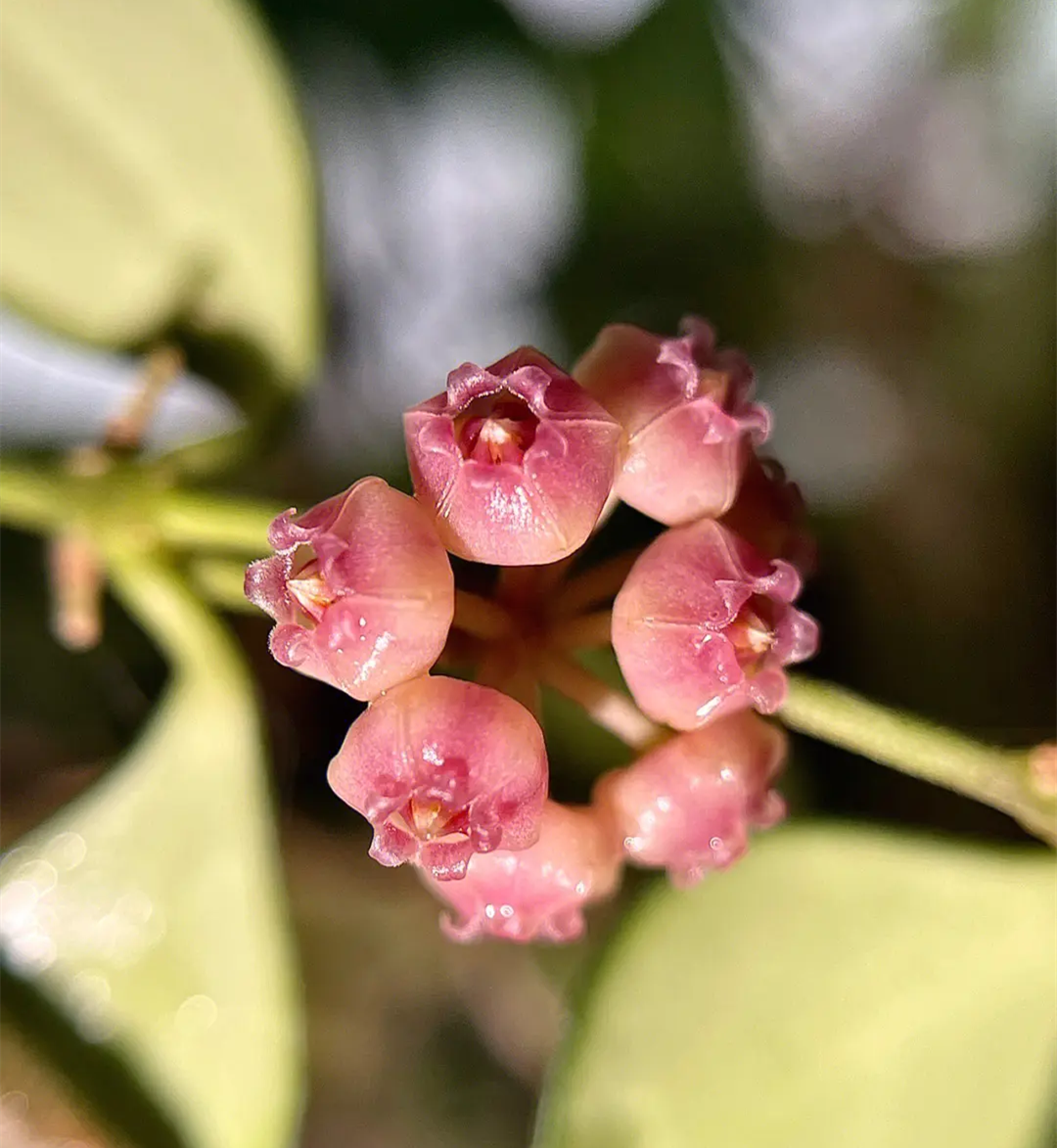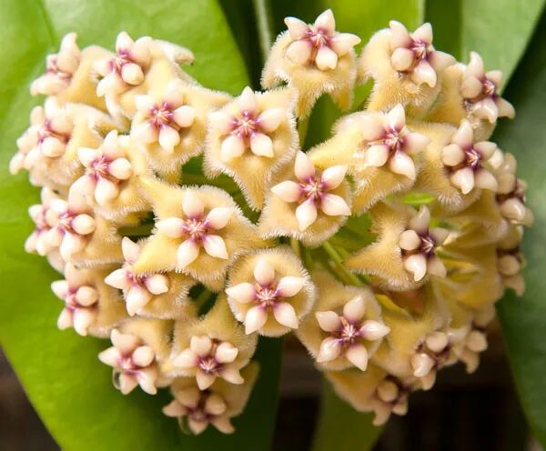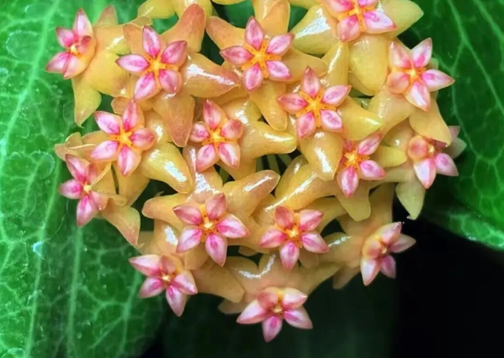 Hoya caudate is also known as “Bronze Hoya”, The leaves are oval, and the surface of the leaves is often covered with white lumps of powder; Corolla yellow or pink, with distinct fine hairs on the margin, subcorolla pink (center red) 。
