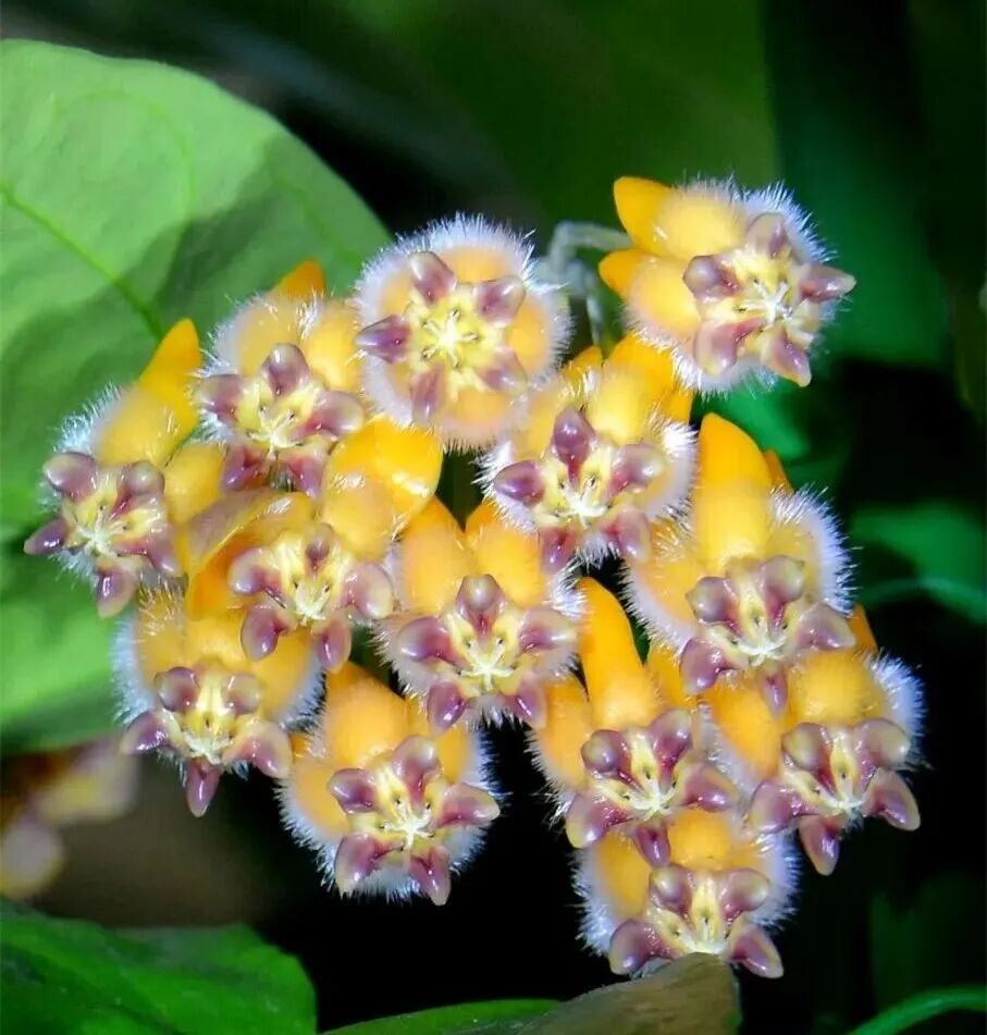 The leaves of Cumin Hoya are oval, Corolla yellow (roll back) , subcorolla yellow (Deep purple in center) , the flowers have a sweet fragrance.