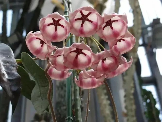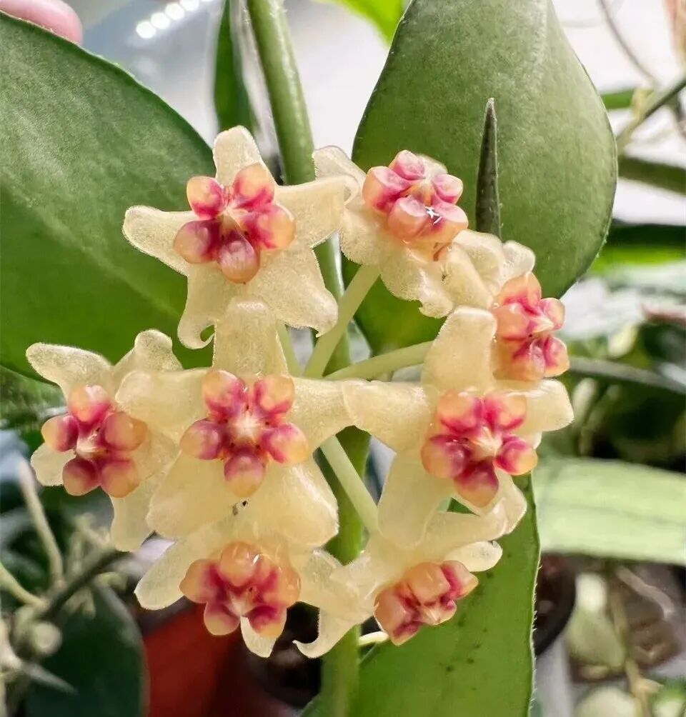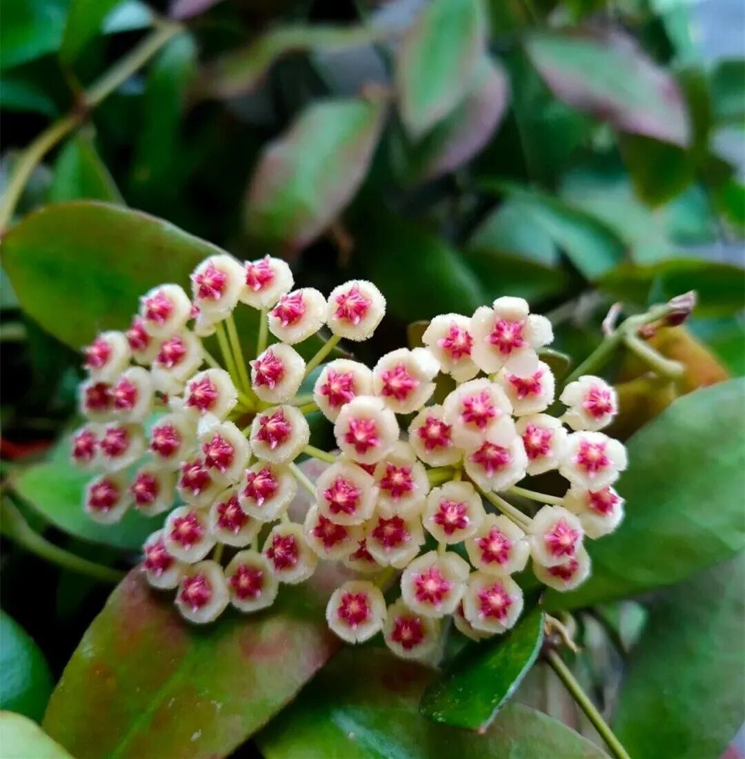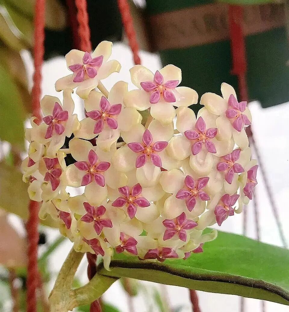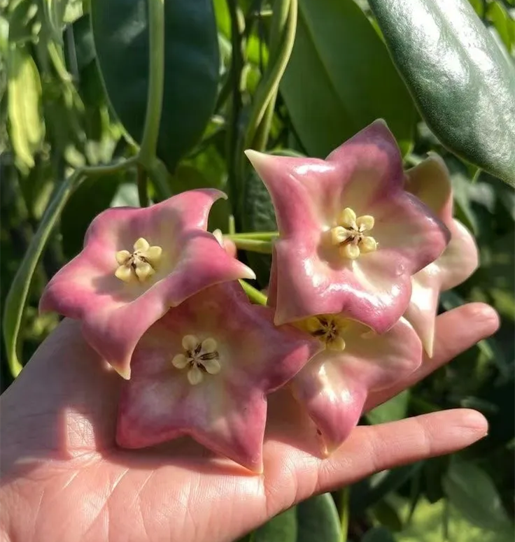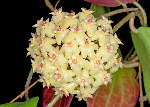 Of Hoya varinensis The leaves are long ovate, usually green ( In autumn and winter, when there is plenty of sunshine, maple leaves will turn red ), corolla white (flipped backwards), secondary corolla pink; Flowers emanate Sweet aroma similar to brown sugar + fruit.