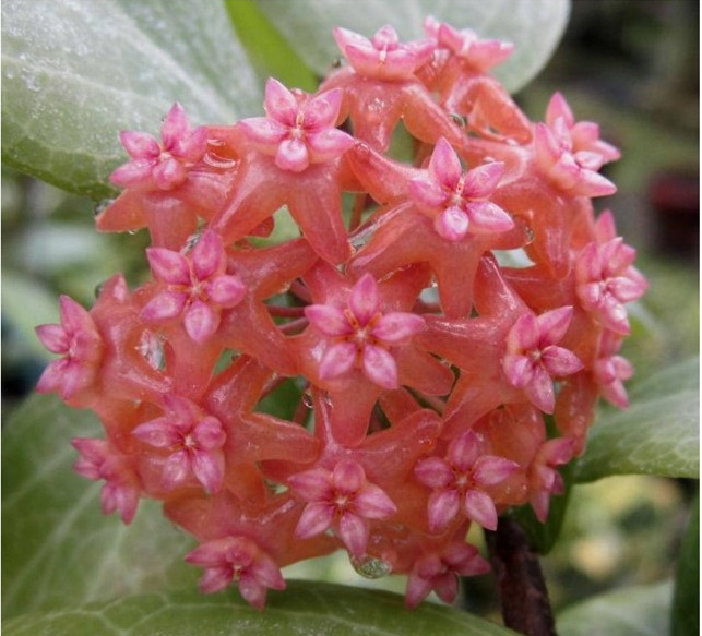 Of Hoya grandiflora Green leaves are narrowly elliptical (apex acuminate, base subcardioid) , big and hard (up to 20 cm in length and 8 cm in width) ; Its corolla is pink and cup-shaped, like a wind chime, and its secondary corolla is red.