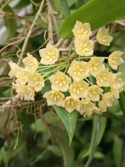 The leaves of Hoya braxiana are more Thin, oblong to sword-shaped, with rough leaf surface; The corolla is bright yellow and inverted cup-shaped, and the secondary corolla is also bright yellow; The flowering period of Bulaxuan Hoya is very long (Flowers almost all year round) , but no floral fragrance.