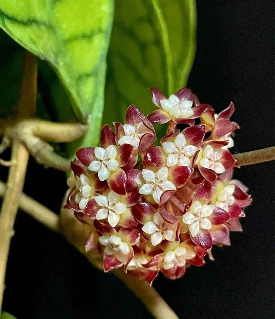 Light hoya orchid is also known as “watermelon peel hoya orchid”, Its leaves are large and oblong, and the leaf surface has a texture similar to watermelon rind; corolla Brownish red (base yellowing) , the corolla is white, the whole flower is crystal clear, exuding a faint caramel smell.