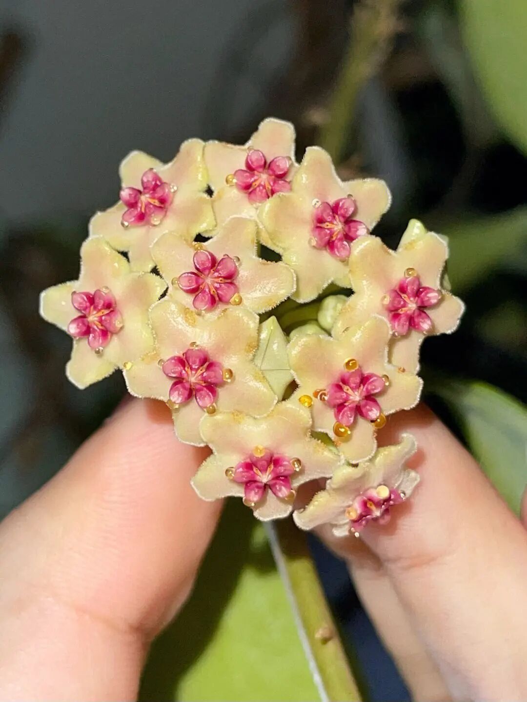 Fisher Hoya is a high-end hoya variety. Its leaves are tough and textured, and the surface of the leaves With obvious lines, leaf color is varied (Green in spring, red in autumn and winter) ; Corolla light yellow (crystal clear) , corolla reddish; The fragrance of the flowers is different at different stages of bloom (It tastes of black tea at the beginning, turns into fruity sweet fragrance in the middle, and turns into yogurt taste at the end) 。