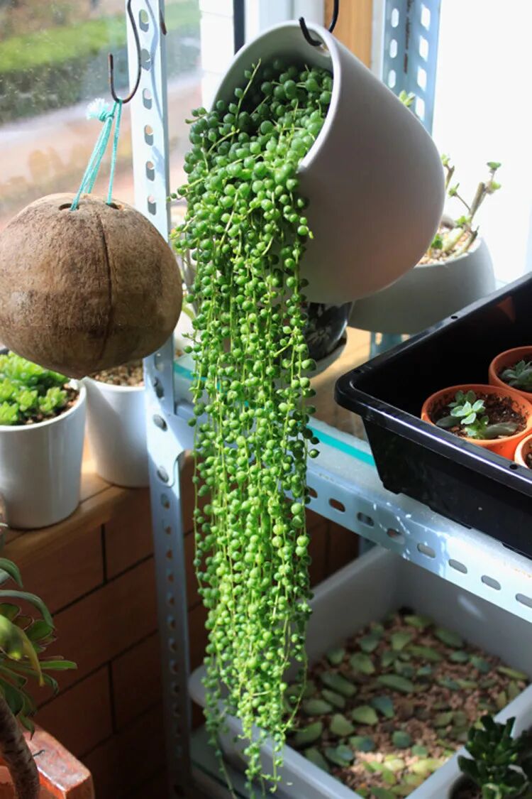 Chlorophytum is our succulent-Buddha beads. The round and fleshy bead-shaped leaves grow on the stems by mistake, hanging down, like knocked over green beads, and have a special wooden fragrance.