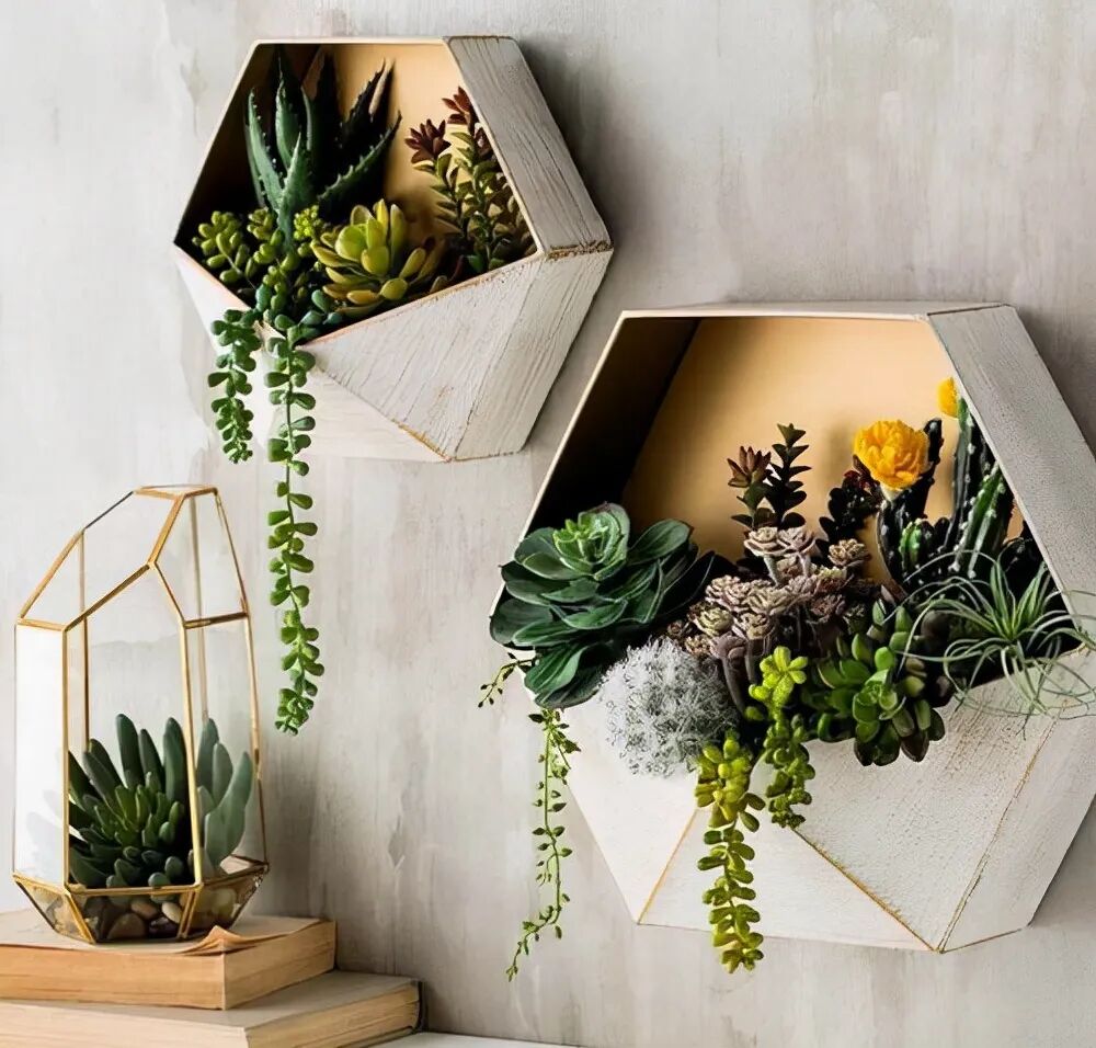 Add color to your walls by planting different types of succulents in hanging pentagonal boxes. You can also plant one in a glass box on the table.