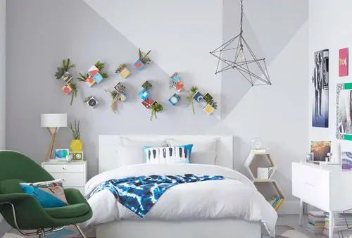 The colorful planters on the bedroom wall and the wire art on the ceiling look simply amazing.