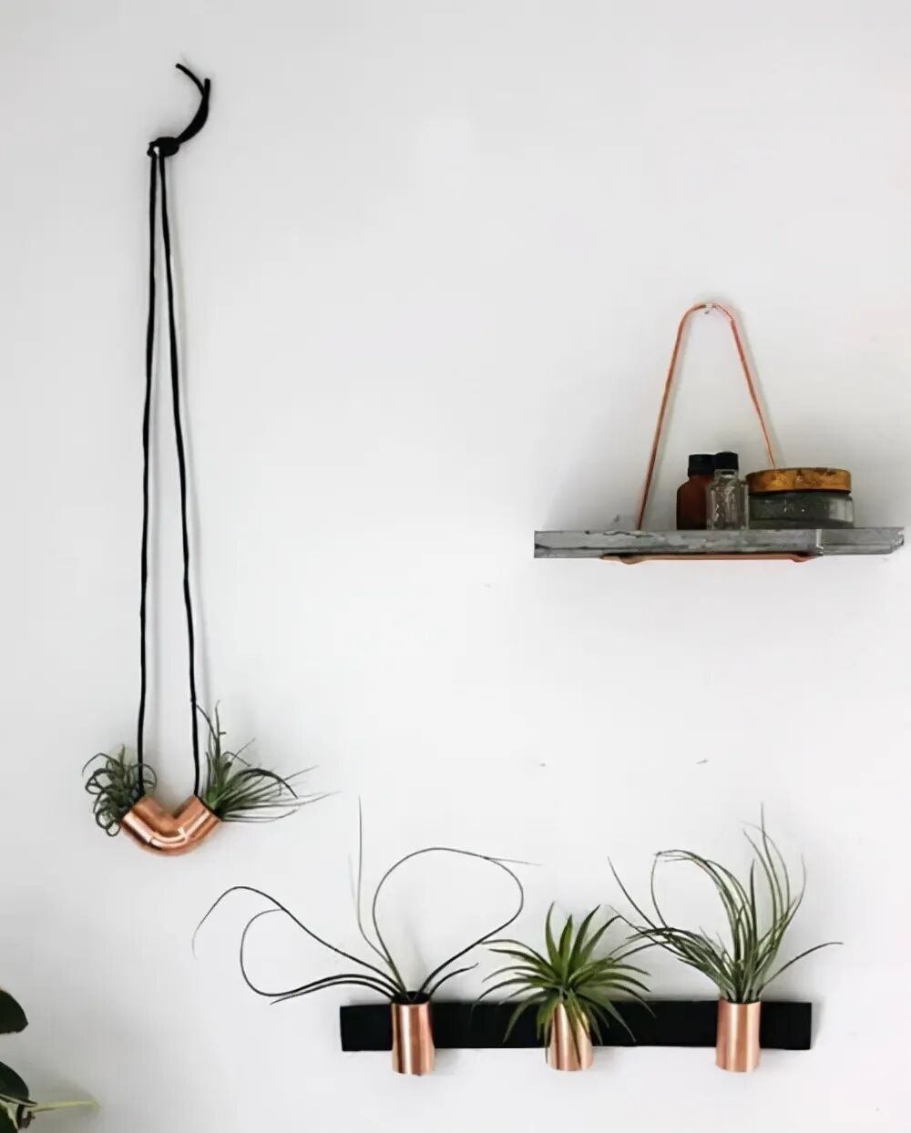 A minimalist wall of plants with copper-colored pipes hanging as planters.