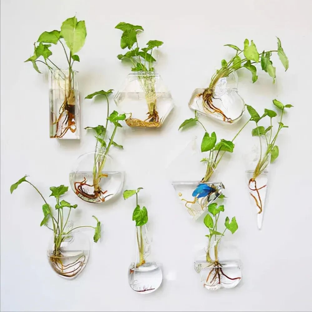 Glue or hang glass jars and vases on the wall, then hydroponically grow pothos and other plants.