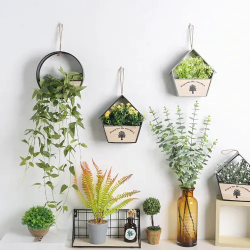 Hang house-shaped planters on the wall and place vases and planters on the table to complete the look.