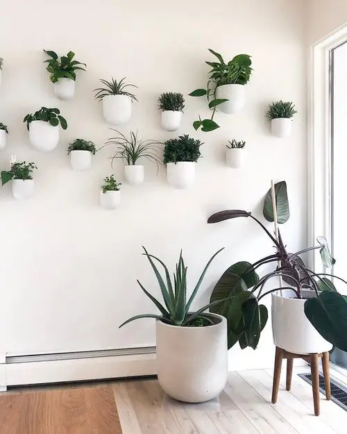 Small white pots on the wall are perfect for growing small vines and succulents, The large leaf monstera deliciosa on the stool will complement the overall look.