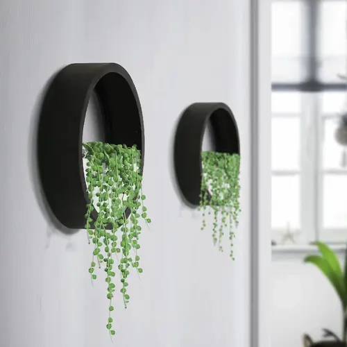 Black plastic on the wall Ring with Trailing plants in pots deposit each other.