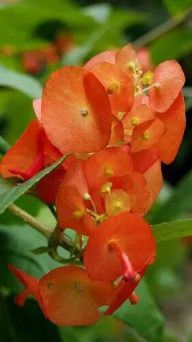 Evergreen shrub, cymes (3 flowers per cyme), vermilion flowers (corolla tube length 2-2.5 cm), and each flower has a vermilion or orange-red butterfly calyx, which is very special. Winter red is a strong positive shrub, and the light must be sufficient.