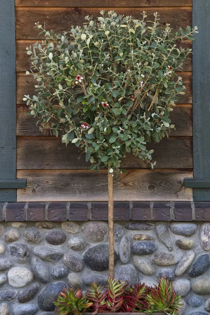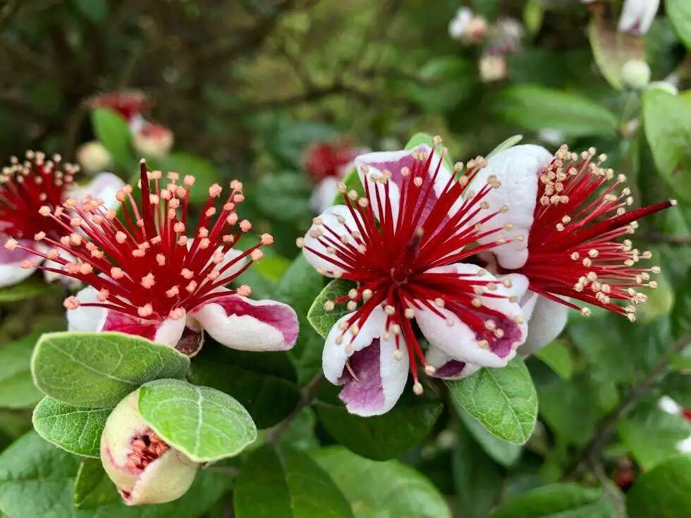 Evergreen shrubs (up to 5-6 m tall), with ornamental value as a whole: The bark is light gray, and the leaves are opposite and oval (thick leathery, dark green and shiny, with silver-gray hairs on the back of the leaves); The flowers are solitary or clustered (the flower diameter is about 4 cm), the flower shape is peculiar, the petals are obovate, the back is white, the inside is purple, and the flower core is red. The flowering period is from late May to early June; The berries are the size of kiwifruit, slightly reddish when ripe, rich in juice, sweet taste of bananas and strawberries, edible, fruiting from late autumn to early winter. Philippine oil fruit likes light, warmth and humidity (especially in the fruit period, there should be enough sunshine and relatively high air humidity), and is drought-tolerant, alkali-tolerant and cold-tolerant.