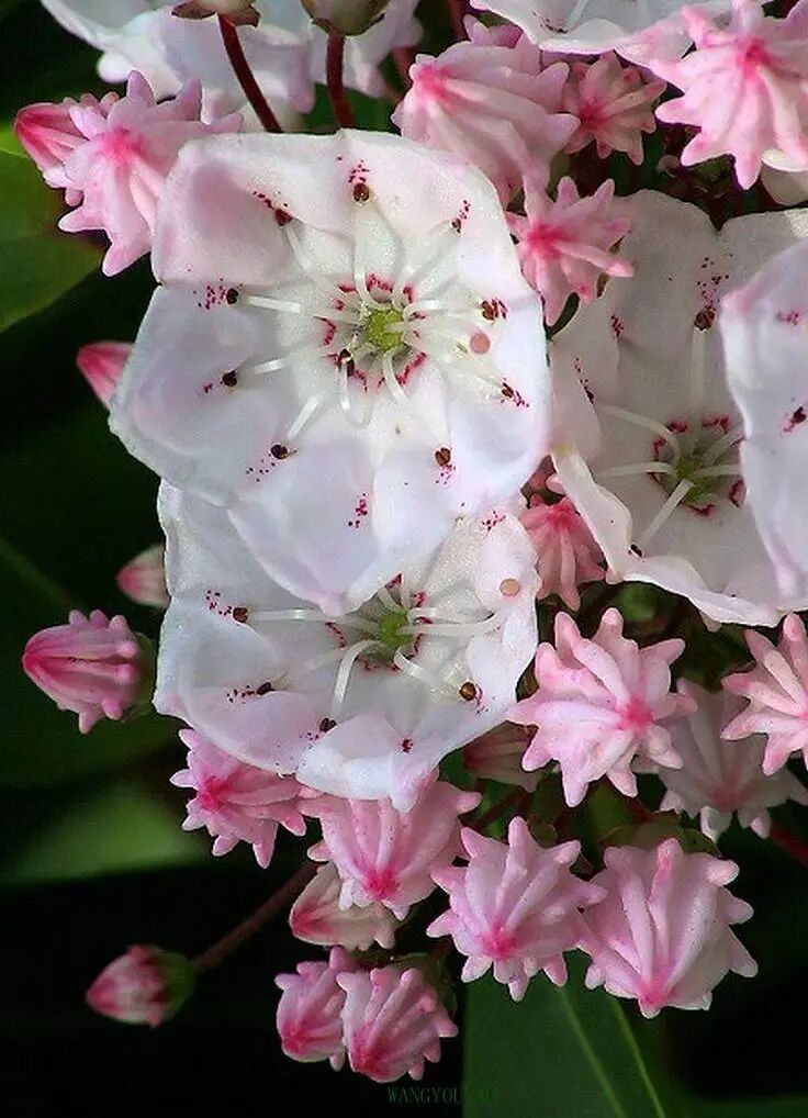 Evergreen shrubs (High 1. 2-3 m), top Raw corymbus The single flower is like a small paper cup upside down, which is very unique. The common flower color is light pink and nearly white. Mountain laurel likes humidity, is cold-resistant, intolerant to dryness, and avoids direct sunlight.