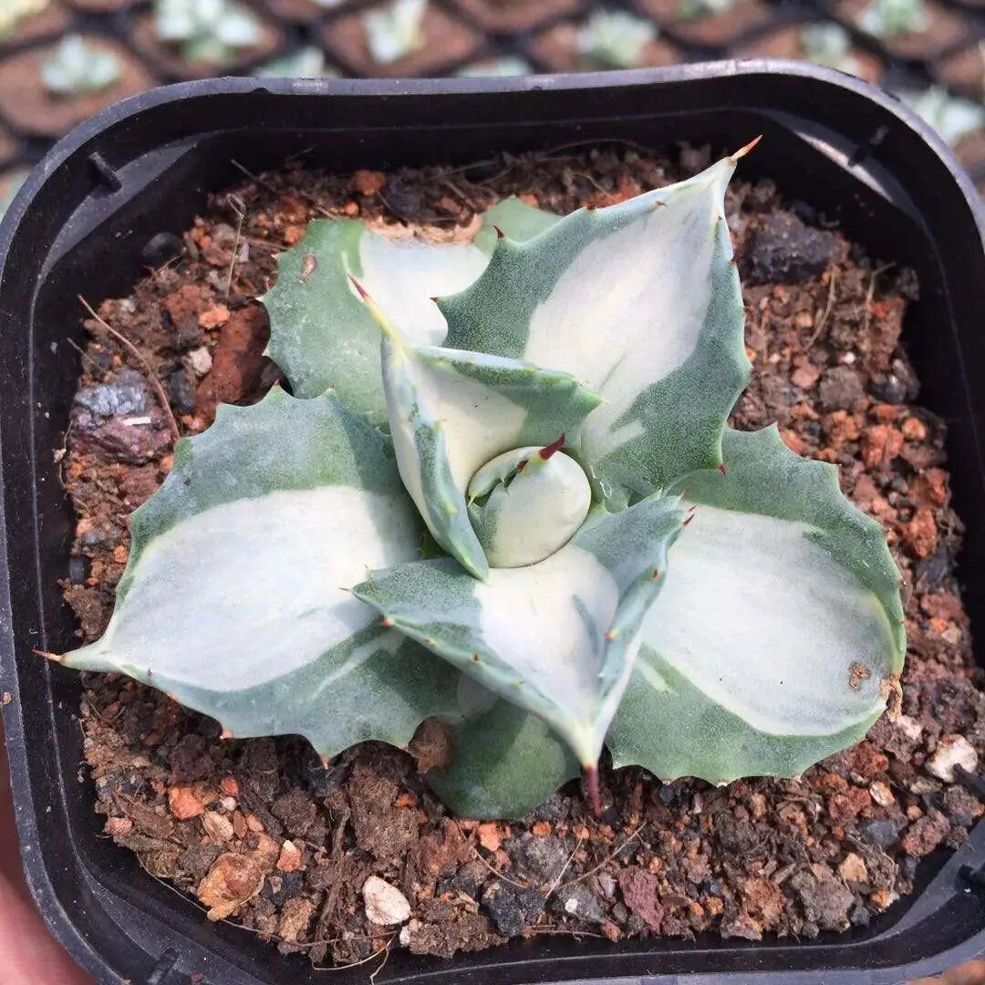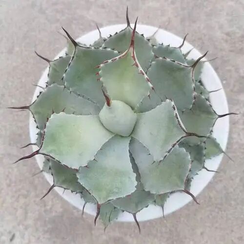 Princess Thor White Middle Spotted Agave is A small brocade variety of Agave grim, with short and wide thick fleshy leaves, which are crab shell-shaped; The leaves are turquoise or blue-green in color, covered with thin white powder, and there are milky white brocade spots in the middle of the leaves; There are sparse fleshy teeth on the leaf margin, yellow or reddish-brown short thorns on the tooth ends, and a short thorn on the top of the leaf.