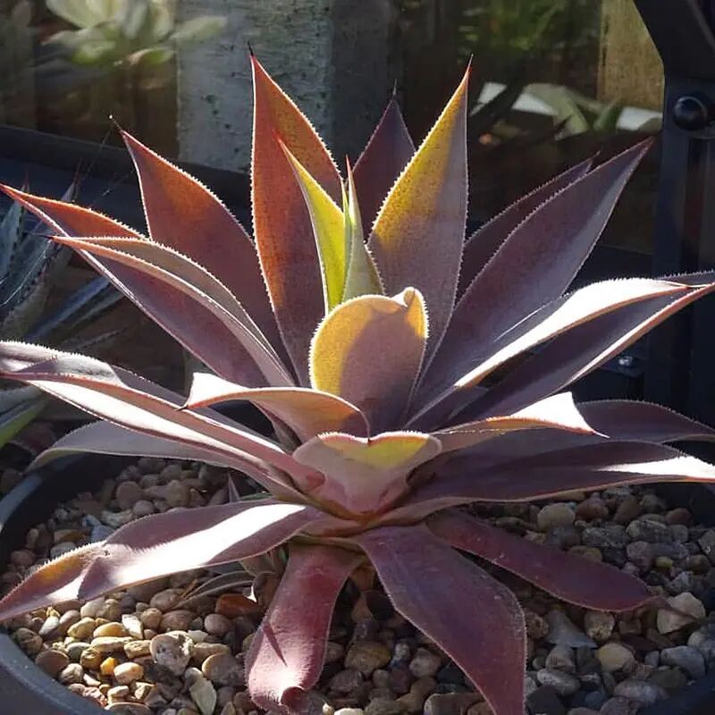 Agave Laiguang, also known as “brown thorn agave”, has a plant width of about 1 m and waxy leaves Short and wide, showing Blue-gray-green; The leaf margin has smaller thorns, Large red thorns at the leaf tips.