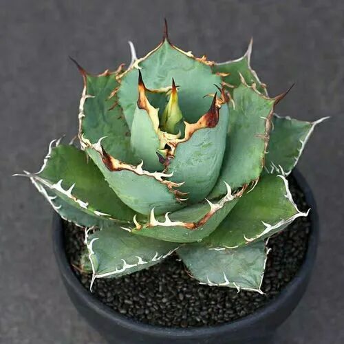 Ren Crown Agave The plant width is 20-30 cm, Turquoise The fleshy leaves are covered with white powder, and the upper half of the leaves is narrowly oval Apical pointed Corrugated teeth of leaf margin (Dark brown stratum corneum in upper part) Each serration has a sharp thorn at the tip , Ye Duansheng has Long and thick Dark-brown spines of (Old thorns white brown)