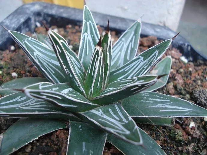 Huishan agave is the Queen Victoria agave Brocade variant, green Triangular cone blade , the apex is thin, the ventral surface is flat, and the back is rounded and slightly keel-shaped; There are regular yellow markings on the edge of the leaves and irregular white lines on the leaf surface; There are white horns on the keel convex of the leaf margin and the back of the leaf, and there are 1-3 black hard spines at the top of the leaf.