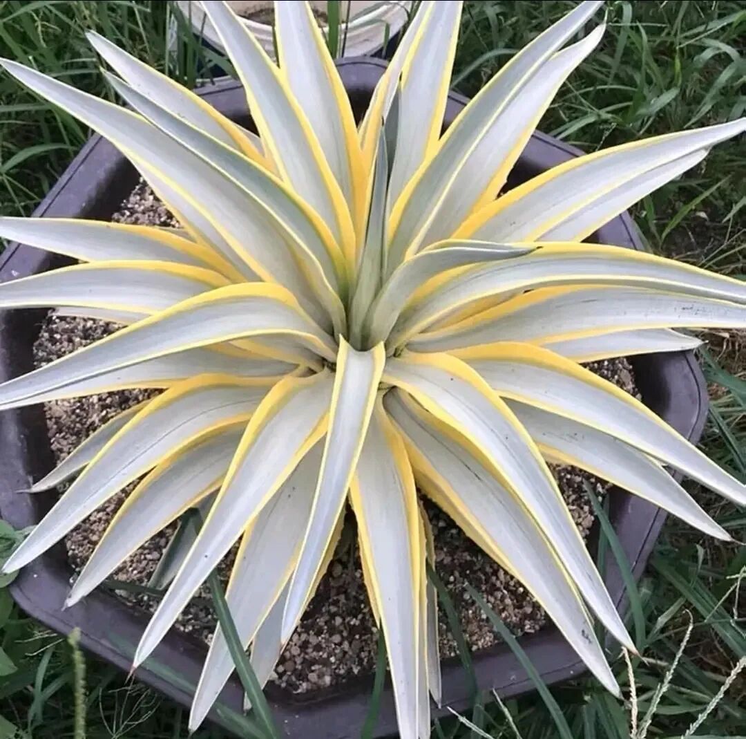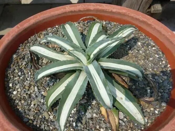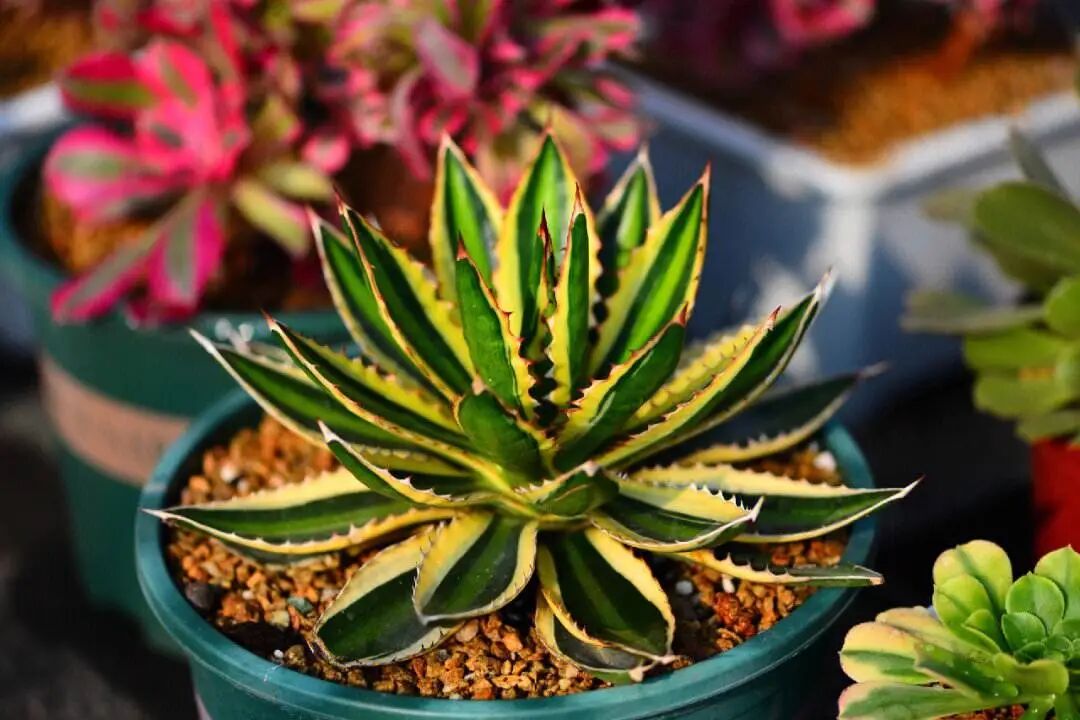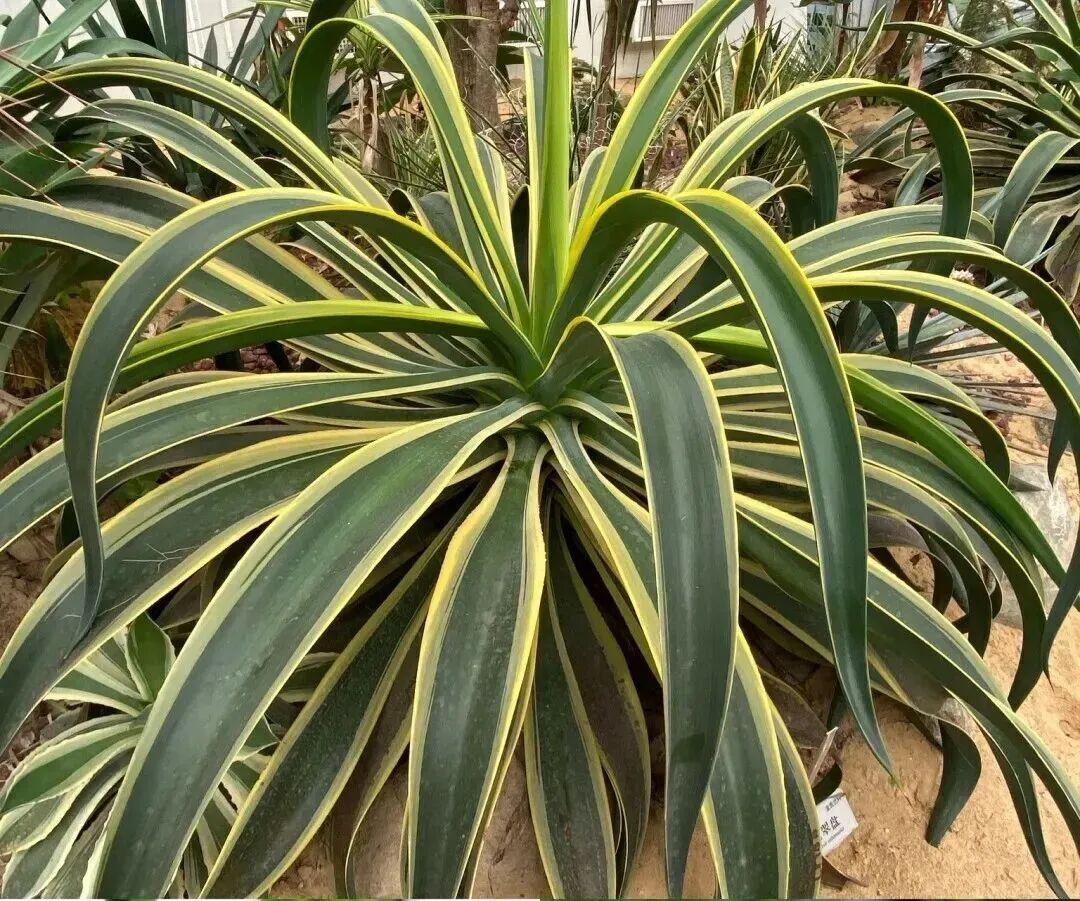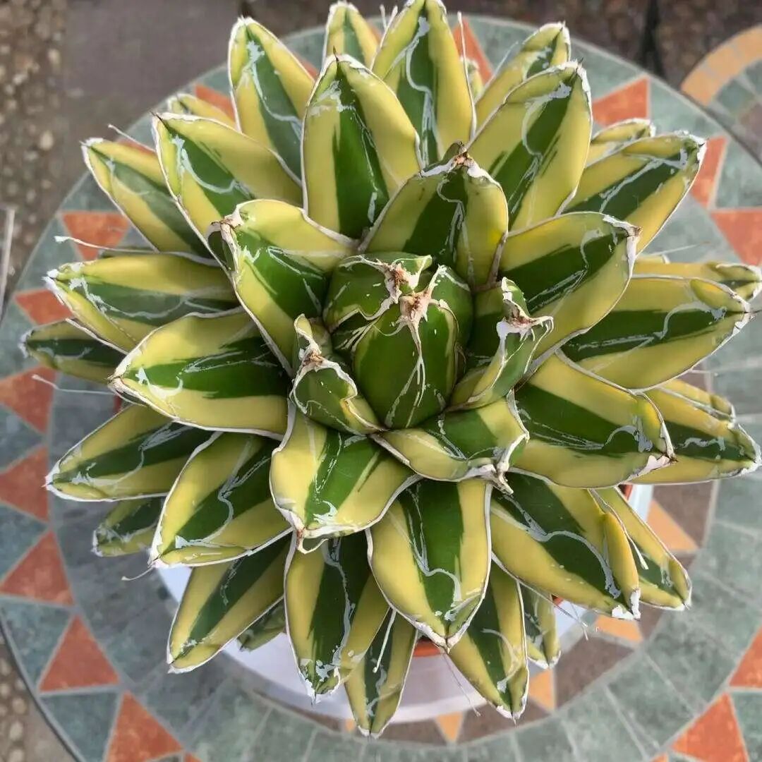 Five-colored Bandai Agave, also known as “Five-colored Bandai Brocade Agave” and “Five-colored Bandai Agave”, is a precious variety of agave. Its fleshy leaves are sword-shaped to lanceolate, with hard and tough leaves, and slightly concave in the middle; The middle of the leaves is yellow-green, the two sides are dark green, and the outermost is yellow. The leaf color contrasts strongly; Leaf margin wavy with short brown spines , there are brown hard thorns at the leaf tips.