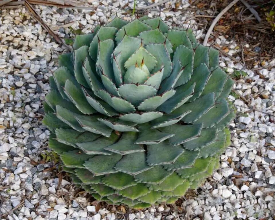 Crab Agave The crown width is about 50 cm, Pink-gray fleshy leaves are oval (leaves narrow towards base, widest near apex) Looks like a crab shell , hence the name ; The leaf margin has a pale deep reddish brown ” tooth “, small spines are born at the end of the tooth, and nearly black slightly longer spines are born at the top of the blade.