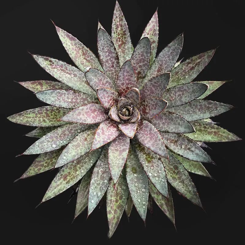 它的叶片相对其他品种而言,不太肥厚,呈三角锥形 (背面圆形凸起,叶片内侧内凹) ,叶表面被有少量白粉,并布有不规则斑点 (强光下斑点呈血色,弱光下斑点呈绿浅色) ;叶缘有漂亮的褐红色锯齿状刺,叶顶端有红褐色硬刺。