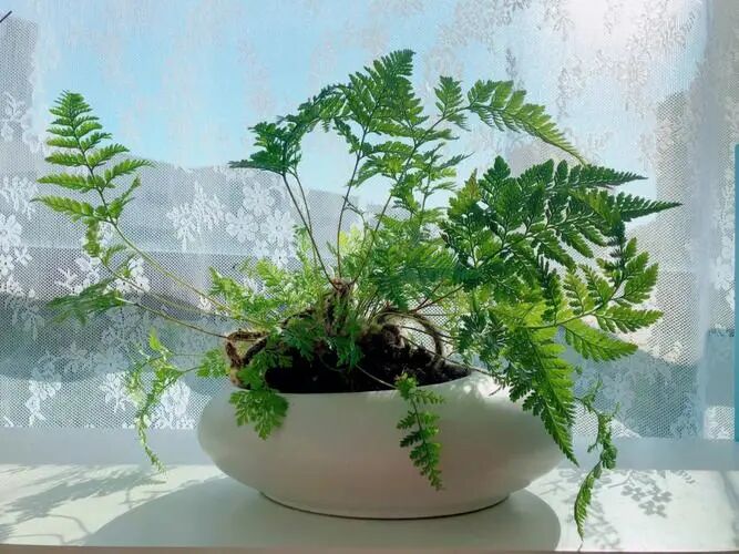 Wolf-tailed fern is a small epiphytic fern. Its pinnate compound leaves are smooth and dark green, which has great decorative effect. However, its biggest feature is the exposed rhizome, with brown scales and hair on its surface, which hangs outside the pot long, like the small feet of rabbits, so it is also called “rabbit-footed fern”.