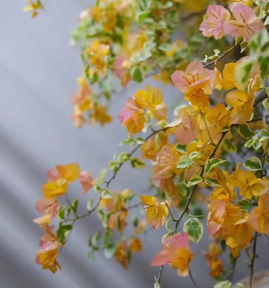 Another yellow variety of bougainvillea, its flowers (bracts) are very similar to dawn triangle, and it gradually transitions from yellow to pink, but its leaves are green, and when combined, it has another taste.