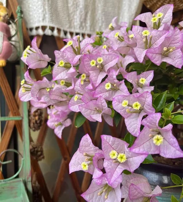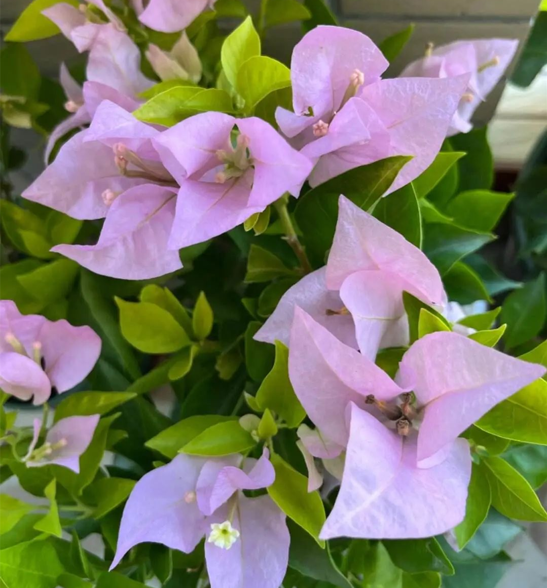 Mrs. Jin belongs to a coarse bougainvillea variety, with strong branches but not soft, large and stretched bracts, long and narrow front section, pale pink purple; The blades are also relatively large, with Leaf color between turquoise and yellow.