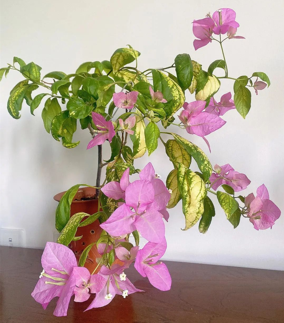 Dark-spotted five-treasure bougainvillea is a literary youth in the bougainvillea family, with dark green leaves covered with Dark spotted pattern, The color of bracts is retro and rich in changes: the color of bracts in spring is generally white; Light pink in summer, with some pink dots on bracts; In autumn and winter, the color of flowers will get darker and darker, and the pink spots on bracts will become more obvious.